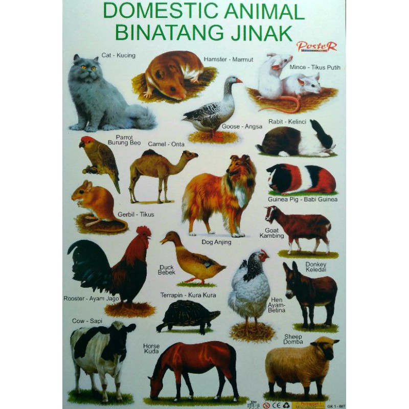 Poster binatang jinak poster binatang jinak adalah poster pendidikan dengan gambar berbagai macan hewan jinak. Haiwan jinak ialah haiwan yang mentoleransi kehadiran manusia.