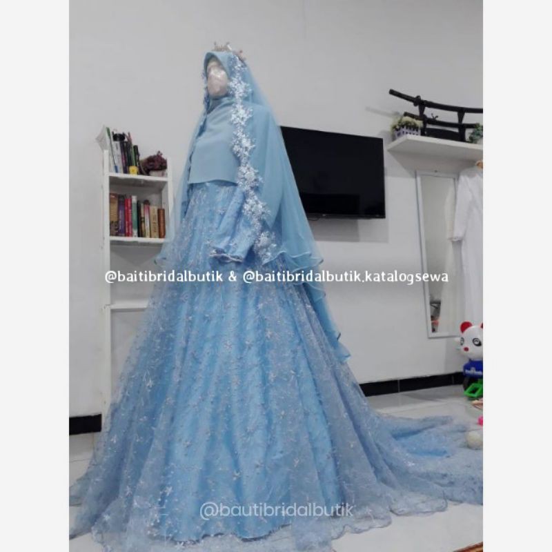 Tb 228 gaun baju pesta pengantin pre wedding dress muslim biru ekor.